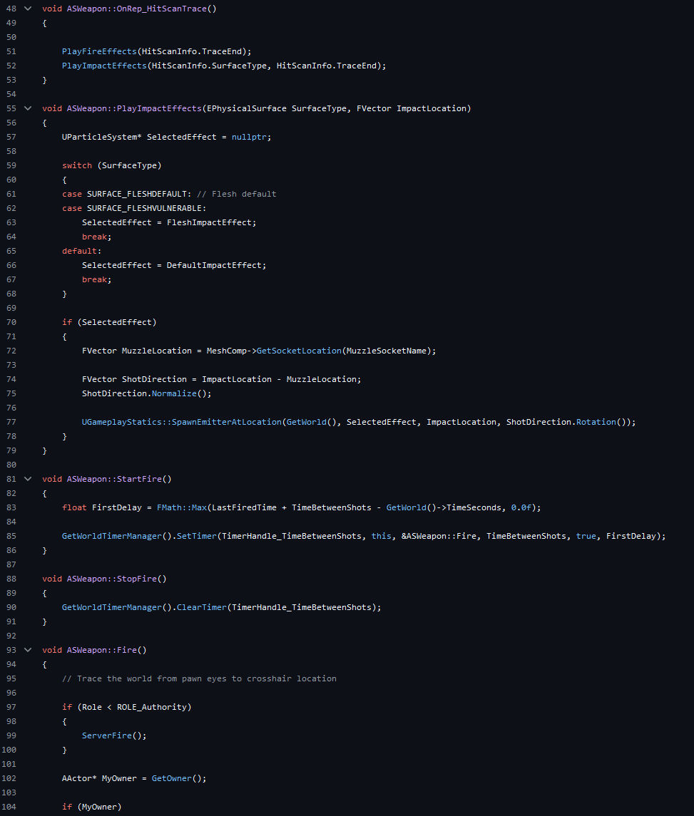 A single base weapon class I created in C++ handles core functionality like spawning projectiles, tracking ammo, and replicating that information to the client for uses like BP implementable events to play effects and audio.